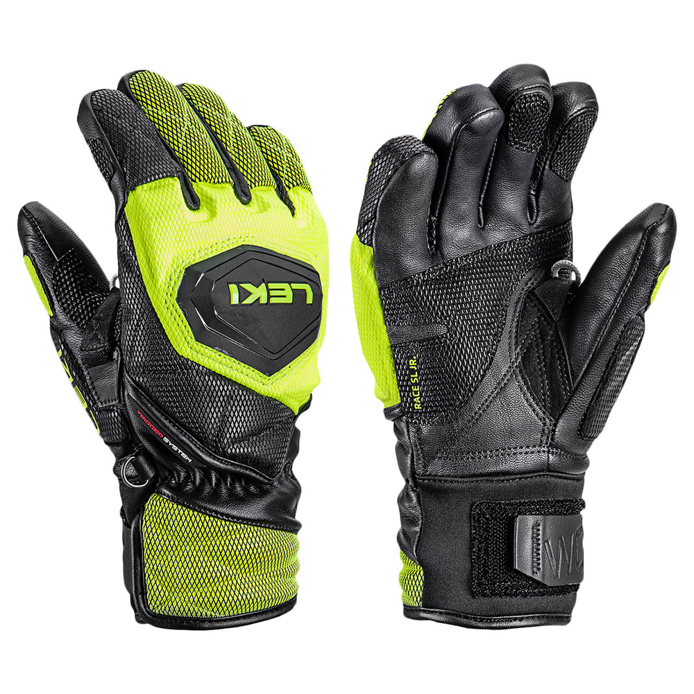 The Leki WCR Venom 3D Junior Glove is built for young ski racers who demand professional-level performance and protection. Developed with input from World Cup athletes, these gloves feature an integrated TPU Speed Panel, silicone polygon finger pads, and ceramic reinforcement for maximum gate impact protection. Premium goatskin leather construction and silicone grip patches deliver a secure connection to the poles, helping junior athletes maintain precision and control through every turn. Thinsulate and Hyperloft insulation keep hands warm, while the Micro Bemberg lining provides comfort and moisture control. Available in bold lemon or pink for a standout look on the racecourse.